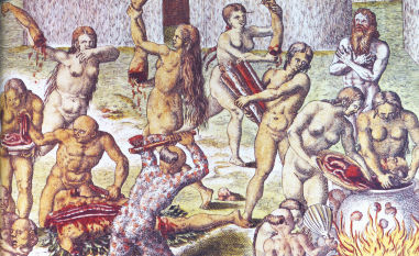 Okrutne ilustracje z księgi Theodore'a de Bry "Americae tertia pars memorabile provinciae Brasiliae historiam contines" z 1562 roku były dla Europejczyków pierwszym spotkaniem z kanibalami.