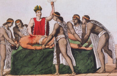 Krwawe rytuały, podczas których wyrywano ludziom serca, pojawiają się u Azteków. Krew ludzka była przelewana podczas niemalże każdego święta. Ofiary wybierano spośród wszystkich członków społeczności, zabijano je, a mięso konsumowano. Takie zachowanie było wynikiem wiary, że bóstwa są okrutne i krwiożercze. Początkowo w ofierze składano jedynie owoce i kwiaty, ale od dnia - jak podają święte sagi Azteków - kiedy Słońce stanęło w biegu i przez trzy dni było niewidoczne, tocząc walkę na śmierć i życie, aby powrócić na niebo, sytuacja uległa zmianie. Tacy bogowie jak Tlaloc (bóg deszczu), Huitzilopochtli (bóg wojny i słońca), Mictlantecuhtli (bóg śmierci) zapragnęli krwi ludzkiej. Dawni mieszkańcy Meksyku byli przekonani, że w momencie, gdy przestaną karmić bogów ludzką krwią -„esencją życia" - świat ulegnie zagładzie. Ponadto spożycie ludzkiego mięsa i krwi wzmacniało siły witalne i przysparzało mocy bogom.